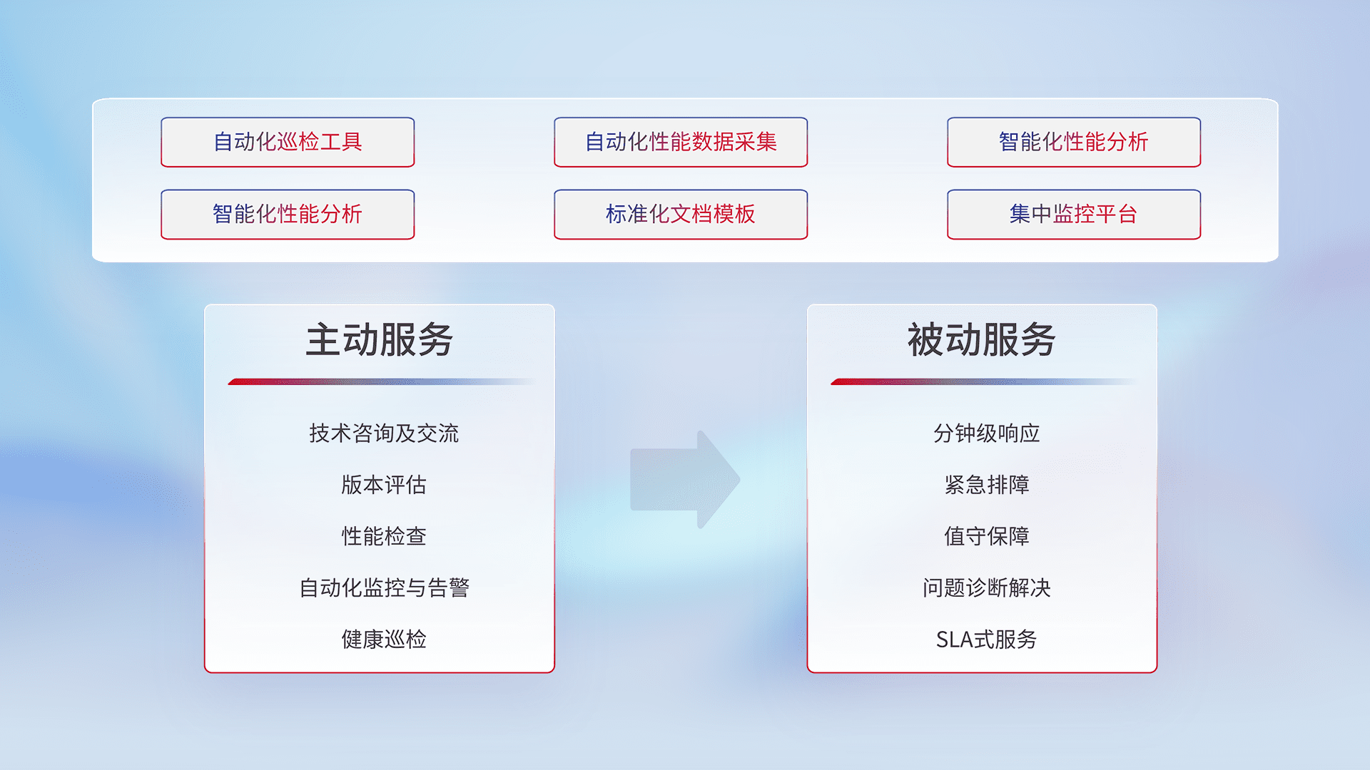 智能化工具和标准化文档,,,,保障服务质量,,,,提供主动服务(包含技术咨询、、、、版本评估、、性能检查、、、、自动化监控与告警、、、健康巡检)和被动服务包含(分钟级响应、、紧急排障、、值守保障、、、问题诊断解决、、、、SLA服务)。。